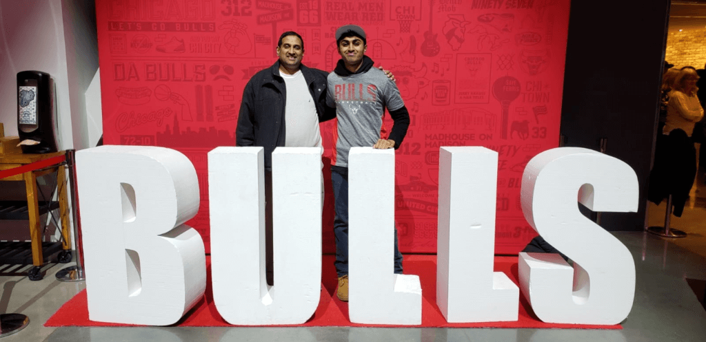 Nikhil and his dad at a Chicago Bulls basketball game.