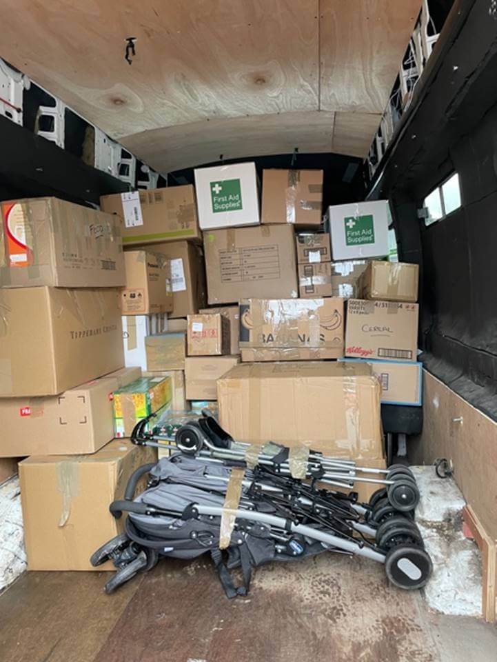 The aid I have in the van was all collected by a local community charity headed by Fiona, with assistance from the large local Polish, Ukranian, and Irish communities, and the community that is Cook Medical. I did several pick ups of donations—three in Nenagh, Ireland and three at Cook Limerick. The van will be jammers.